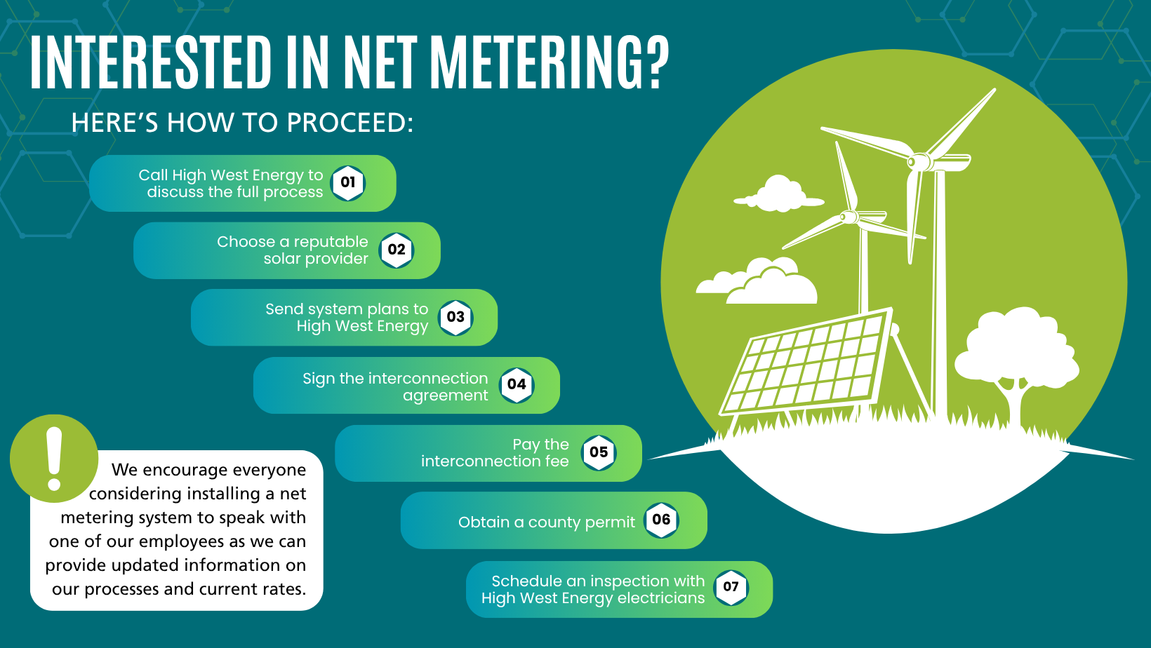 Residential net metering systems are becoming more popular. Homeowners are exploring net metering options to help power their homes. High West Energy has two types of net metering on our system: wind turbines and photovoltaics, also known as solar systems. The most common of these two is solar, which a member can put on their rooftop, or they can install a ground array of solar panels. The amount of electricity produced by a net metering system depends on several factors, including the size of the system installed, your home’s sunlight exposure, and even the time of the year.